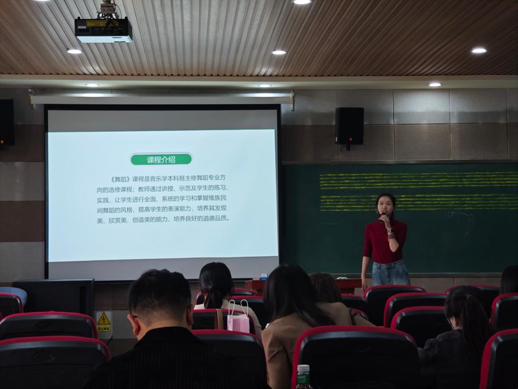 第二阶段说课展示由声乐与舞蹈教研室教师赫思思带来关于课程《舞蹈》的教学介绍。她围绕说教材、说学情、说教法、说课堂设计,生动演绎了舞蹈课的课堂教学魅力,并分享了自己总结的一套行之有效的教学四步法:讲授法、直观演示法、单一练习法和纠正鼓励法。通过四个环节的紧密配合,学生们能够全面且系统地学习维吾尔族民间舞的独特风格,不仅有助于提升个人的表演能力,还能有效助力提升学生发现美、创造美的艺术素养和良好道德品质的形成。