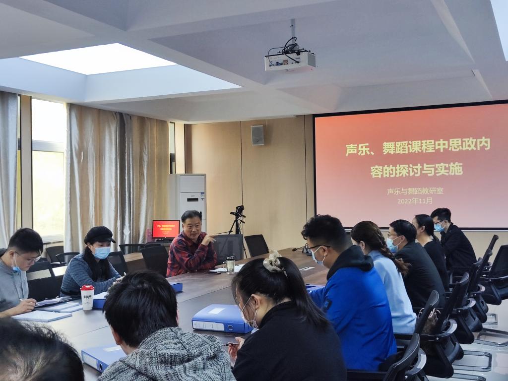 为进一步深化“课程思政”教学改革,更好地推进“课程思政”建设工作,发挥课堂立德树人的主渠道作用,声乐与舞蹈教研室于11月4日下午,在艺术楼会议室举行了“声乐、舞蹈课程中思政内容的探讨与实施”的专题教研会,会议由声乐与舞蹈教研室主任吕倩倩老师主持,音乐学院院长王凯歌出席了活动,教研室内全体教师参与了本次活动。