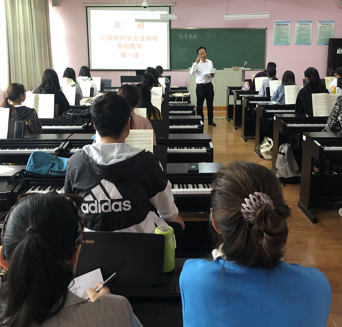 王在畅教授首先讲授理论知识,介绍钢琴的由来和发展变化,钢琴的特性,并通过弹奏向学生展示钢琴的音色和强弱,讲述钢琴在中国的发展,引入课程思政。以《黄河大合唱》、《义勇军进行曲》等为例,倡导爱国主义精神。接着,又讲了钢琴弹奏的基本要求,坐姿、手型、非连音奏法。除了生动形象的理论知识的讲解,王教授注重学生在课堂上的自我发挥,体现了以学生为主体的教学思想,注重知识的传授与能力的培养相结合,教学理论与实际运用相联系。