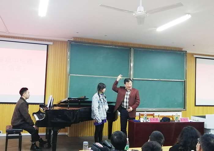 王凯歌教授从“脚根”、“三结合”与“三来”的契合、当前声乐演唱中所存在的问题、戏曲演唱出现的问题、“三结合”理念的支撑、歌唱是流动的思维、歌者必调其气、“字正腔圆”是传统演唱化文索意等七个方面进行了深入浅出地阐述,并进行现场实践教学,使师生对声乐演唱与戏曲之间相互借鉴有了更加清晰的认识。
