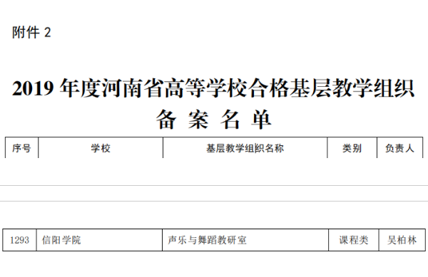 近日,从省教厅获悉,根据河南省教育厅《关于做好 2019 年度河南省高等学校基层教学组织达标创优建设工作的通知》(教办高〔2019〕396 号)要求,经评定,我院声乐与舞蹈教研室进入“2019年度河南省高等学校合格基层教学组织备案名单”。这是我院在专业建设、人才培养迈出的重要一步。我院将按认真对照《河南省高等学校优秀基层教学组织认定标准(试行)》和《河南省高等学校合格基层教学组织建设标准(试行)》相关文件精神,明确建设目标与任务,切实提高人才培养能力。