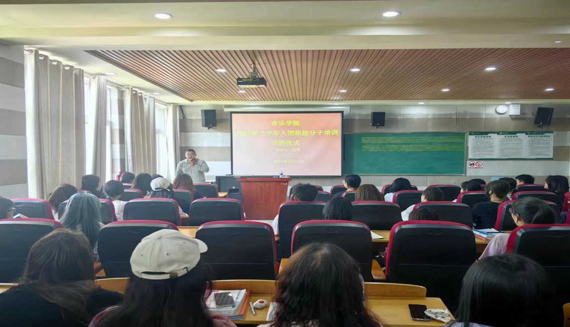 为深入贯彻党的二十大精神,充分响应团组织教育青年的号召,进一步提高当代青年的思想素养,加强对入团积极分子的教育、培训和考察,促进共青团工作的阵地建设。5月14日中午,在艺术楼205教室,音乐学院举办2024年入团积极分子培训班开班仪式。音乐学院团总支书记闫贵以及52名入团积极分子参加开班仪式。会议由张博雅主持。