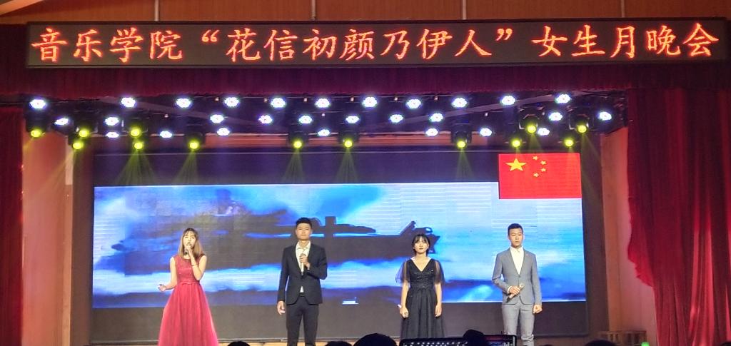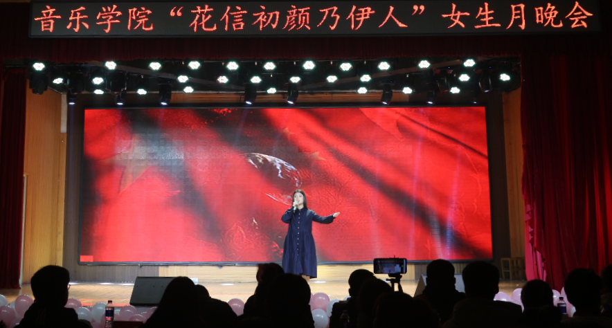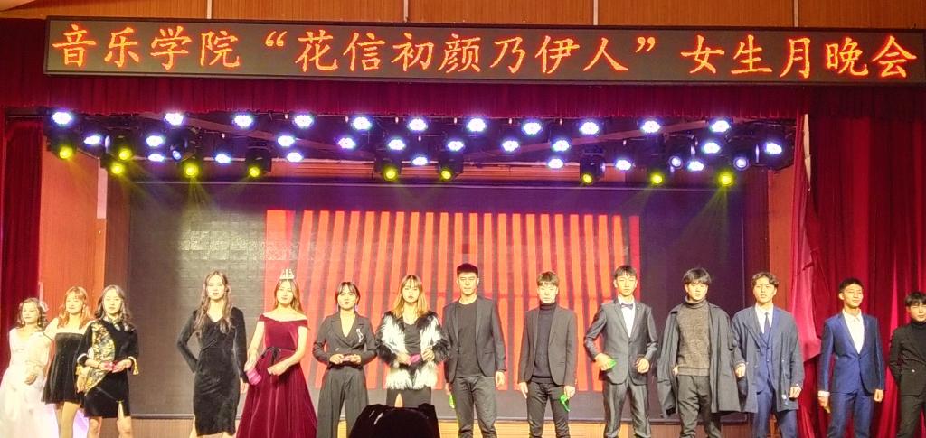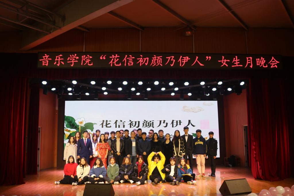 2019年11月25日晚,音乐学院在大学生活动中心举办了“花信初颜乃伊人”主题女生月晚会。团总支书记裴奇、辅导员施庆富、李方程以及音乐学院部分学生观看了本场演出。