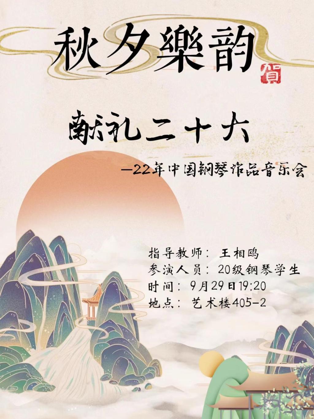 在党的二十大即将到来之际,为弘扬中国传统文化,展现中国钢琴作品所具备的独有的东方艺术魅力,9月29日晚上,钢琴与器乐教研室在艺术楼405举办了“秋夕乐韵 献礼二十大——2022年中国钢琴作品音乐会”。本次音乐会由王相鸥老师担任指导老师。
