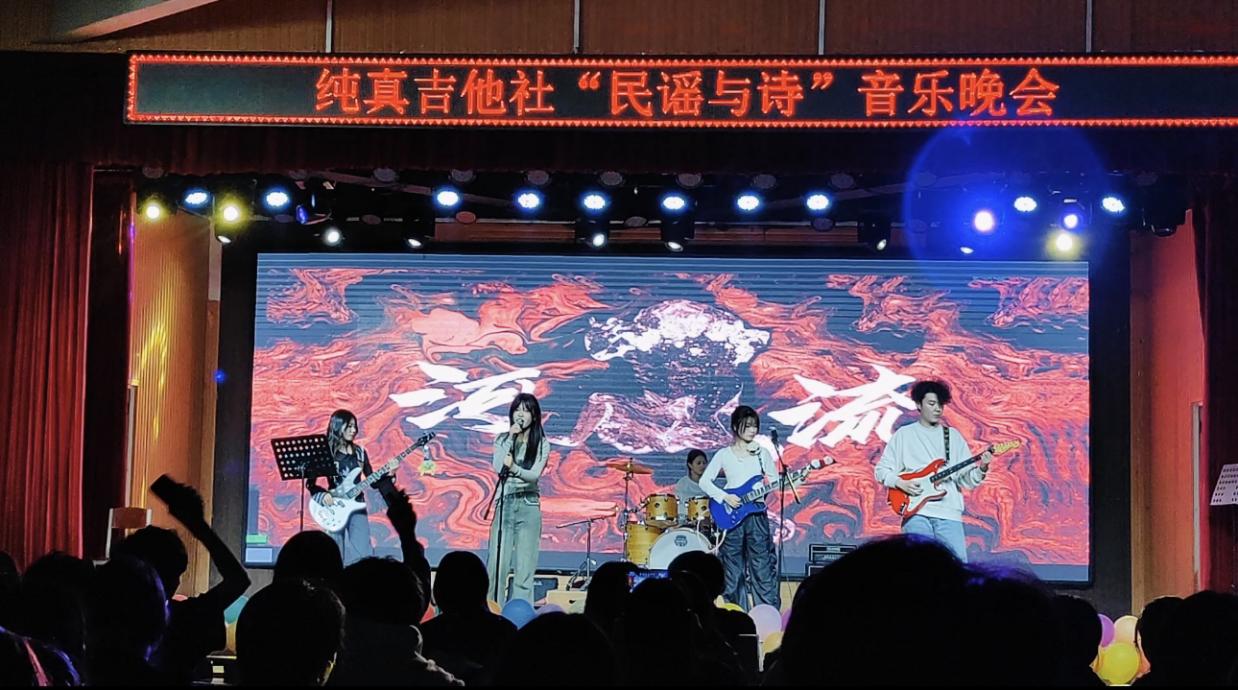 2024年3月30日晚7点,由纯真吉他社打造的“民谣与诗”活动在大学生活动中心举行。这次活动的举办,旨在丰富大家的校园生活,在一个没课的晚上,用音乐使大家放松下来,并且给社内爱好音乐的成员一个表现自己的机会。
