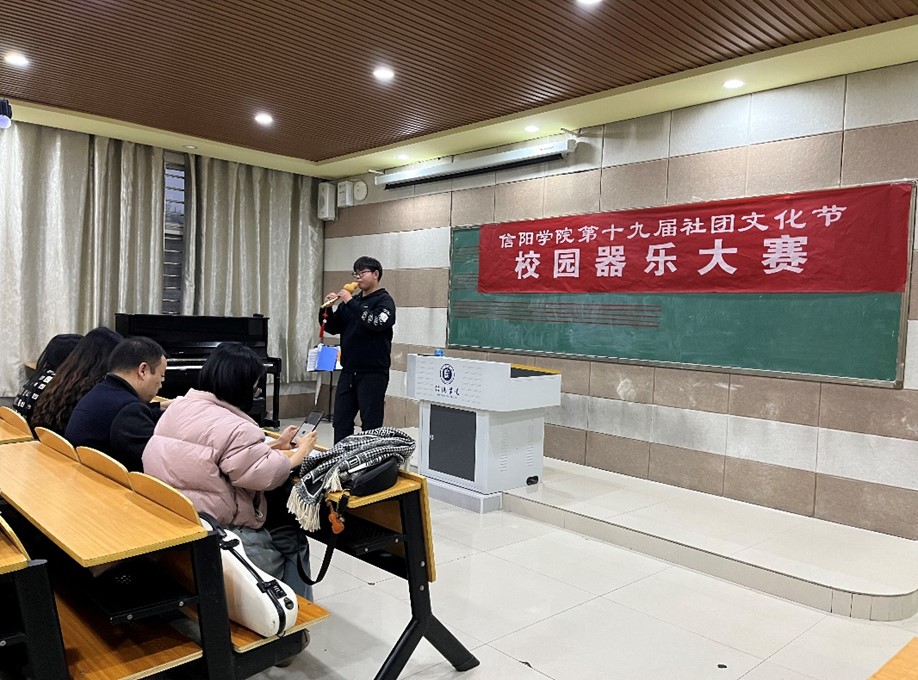 为了繁荣校园文化,推进大学生素质教育,丰富校园文化生活,拓展学生素质,为热爱器乐的学生搭建展示才华的平台,激发他们对器乐演奏的热情,增强自信心。12月3日,在艺术楼202教室,信阳学院第十九届社团文化节校园器乐大赛成功举办。钢琴与器乐教研室主任胡世红,青年教师张梅鑫、许驰瑶、沈萌共同担任本次比赛的评委。