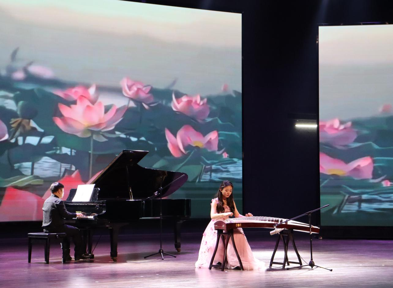 第六首曲目《雨莲花开》以传统筝曲《出水莲》的核心音调为素材,在保留核心音调基础上创新发展,将中国传统音乐元素与西方现代作曲技法结合,演奏者们以古筝与钢琴之间的对话,展现出当代筝乐发展在乐器表现力、演奏技术和曲目创新等方面的包容性,生动展现莲花在风雨中或动或静、玉洁冰清且坚韧不拔的形象。