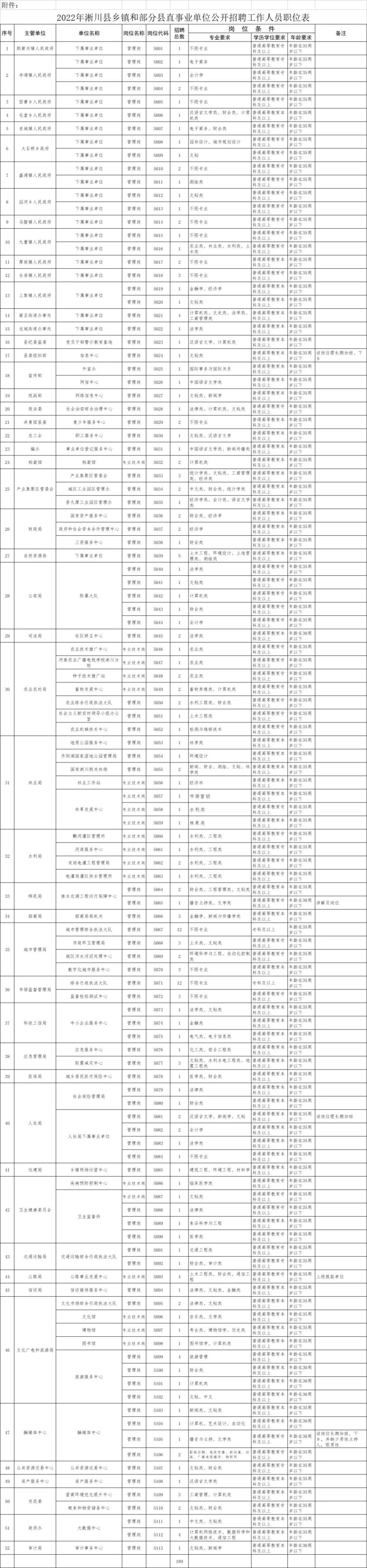 本次招聘事业单位工作人员189名。具体岗位及条件详见《2022年淅川县乡镇和部分县直事业单位公开招聘工作人员职位表》