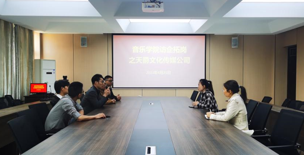为落实关于“访企拓岗促就业”专项行动的要求,拓宽毕业生就业渠道,推进2025届毕业生就业工作,5月12日下午,河南天爵文化传媒有限公司一行来音乐学院参观考察并参加校企合作洽谈会,音乐学院学工秘书李平、毕业班辅导员姚垚、李艳玲接待了熊经理一行。