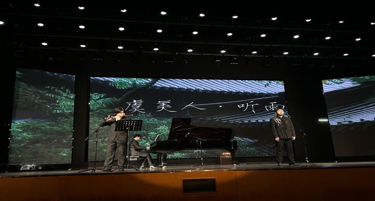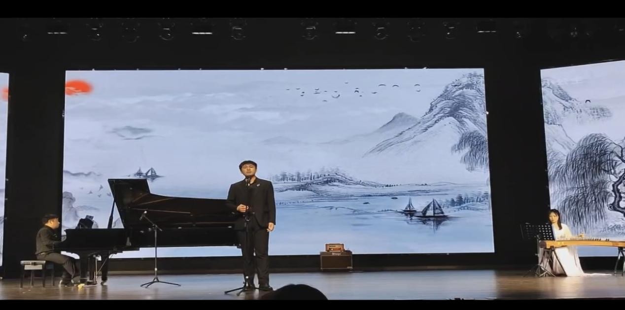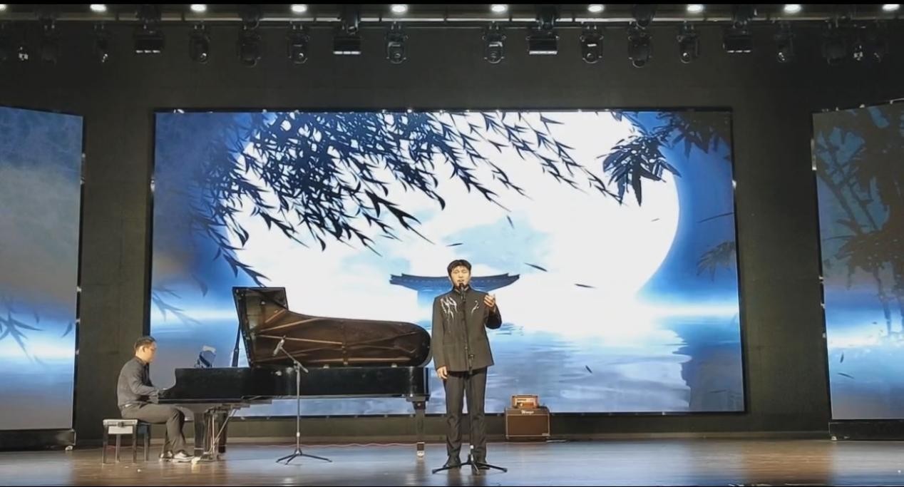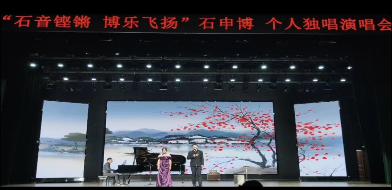 本场音乐会是本学期继梁科硕独唱音乐会后的又一学生独唱音乐会,主唱石申博及助演嘉宾带来了覆盖信阳地方民歌、创作性民歌等不同类型、不同风格的声乐作品共14首,演唱涉及独唱、男声二重唱、男女声二重唱等多种形式,伴奏囊括钢琴、古筝、竹笛、非洲鼓等乐器,整场晚会内容丰富,形式多样,富有层次,生动展现了学生的专业学习成果和艺术实践水平。本次音乐会不仅是石申博个人专业学习的阶段性汇报,也是他学习生涯中重要的艺术实践经历,在舞台上,石申博以个人之赤诚对话音乐历史长河,用歌声传递文化自信,热情表达了优秀传统音乐与现代元素激荡共鸣的深刻理解。
