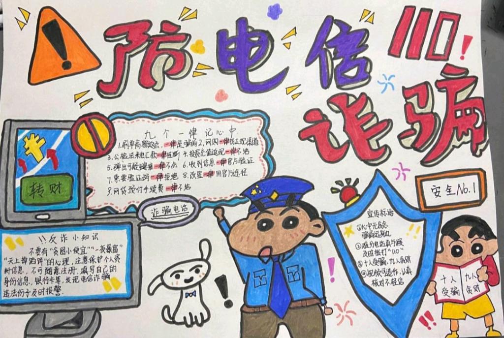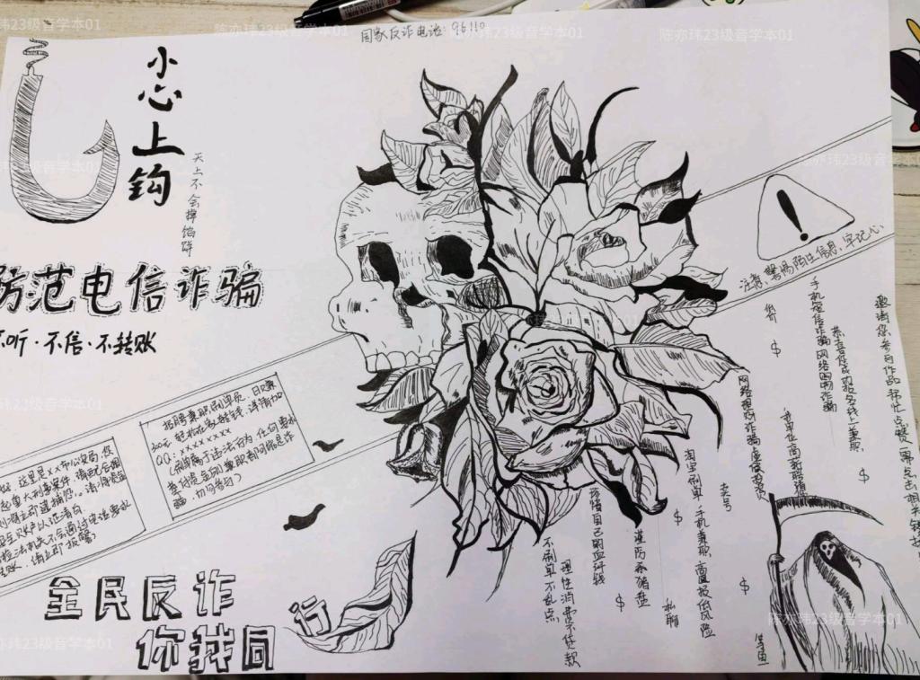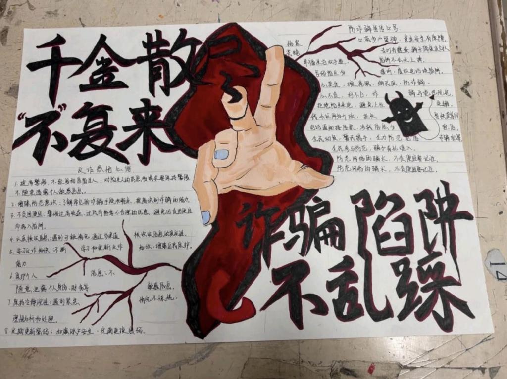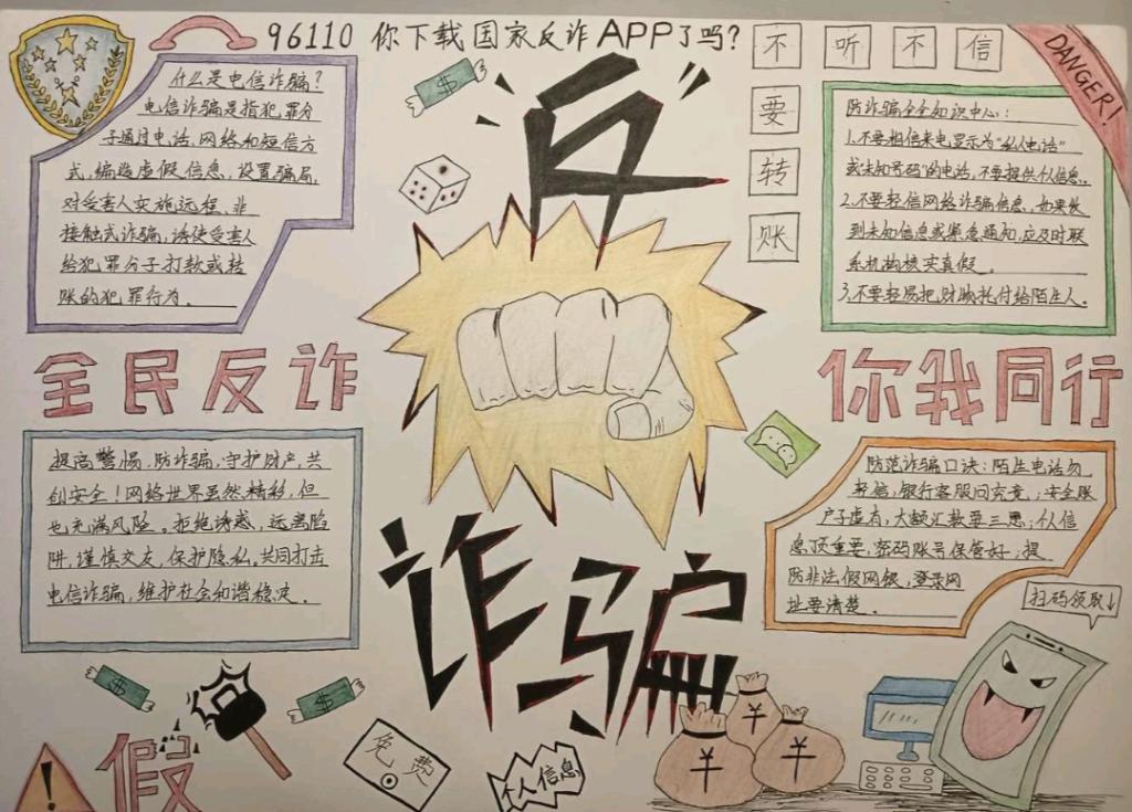 此次手抄报活动的成功举办,不仅有助于提高同学们的安全防范意识,同时进一步筑牢了校园反诈防线,增强了同学们识骗防骗的能力。