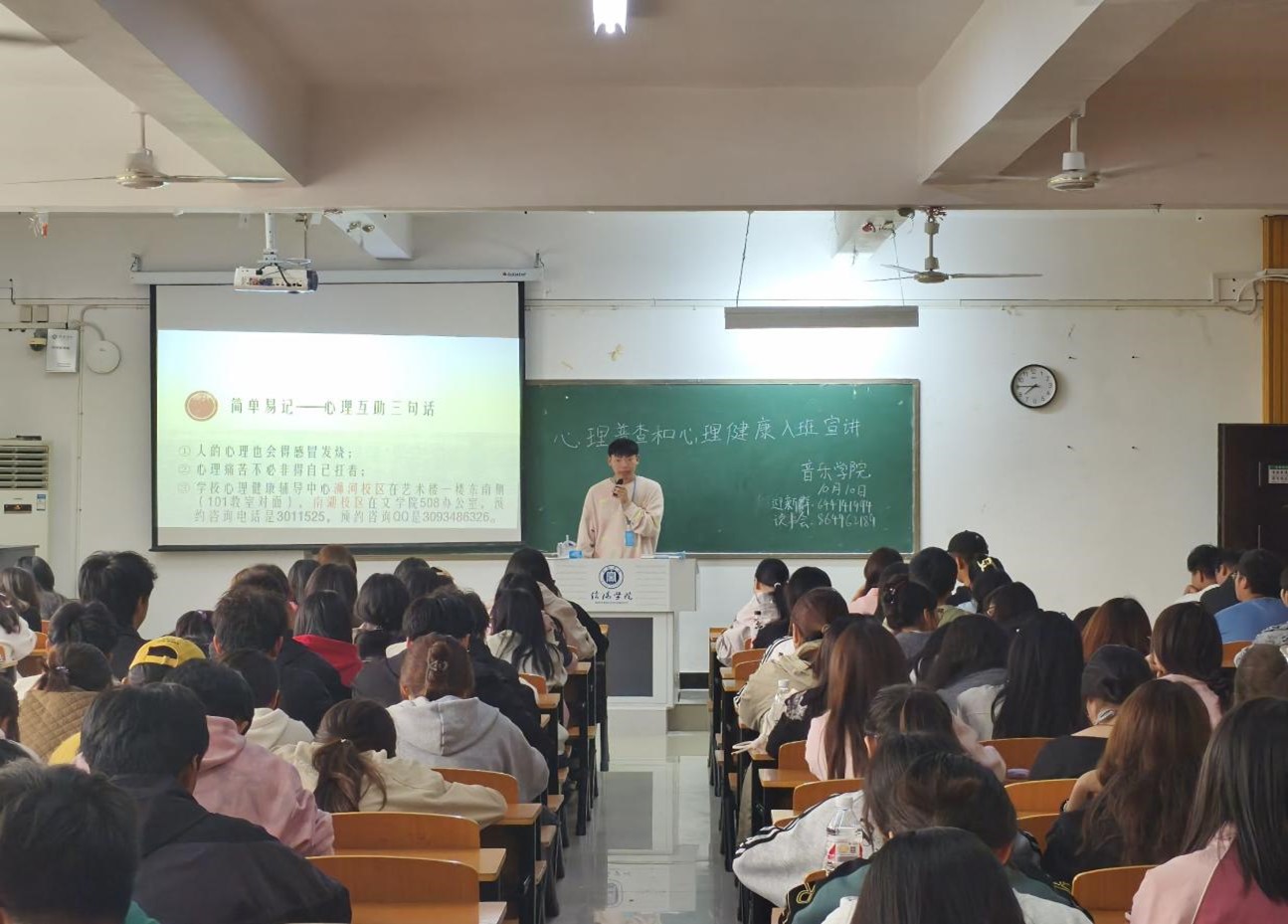 为了全方位地了解2024级新生的心理健康状况,切实提高新生的心理健康意识,学院精心组织并开展了新生心理健康普查宣讲活动。于10月10日中午在音乐学院艺术楼407教室举办。此次活动邀请心理健康中心宣讲员作为主讲人,音乐学院心理辅导站站长姚垚组织了此次讲座,学院心理健康部全体成员和2024级全体新生参加了此次心理健康普查入班宣讲活动。