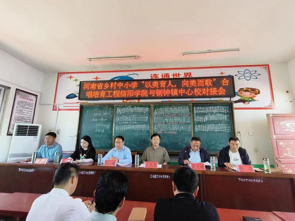 6月7日上午,河南省乡村中小学“以美育人、向美而歌”合唱培育工程信阳学院与正阳县铜钟镇中心校对接会在铜钟中心校会议室举行。音乐学院院长王凯歌、书记郑山峰、合唱指挥专任教师朱燕,正阳县教体局党组成员肖立峰、体卫艺负责人崔杰,铜钟中心校校长陈继荣、音乐教师王长旺等出席了本次活动。学校教师代表和“小金钟”合唱团团员参加了活动。陈继荣主持了活动。