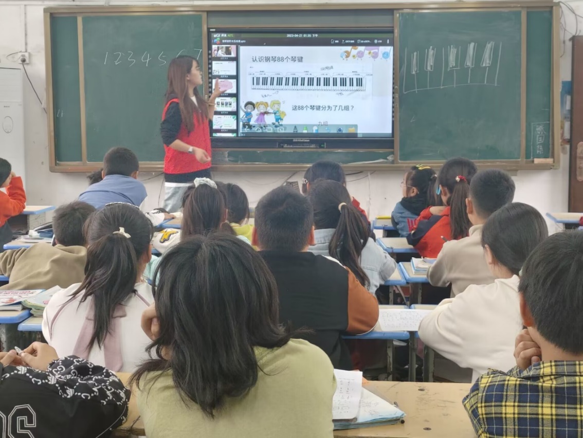 志愿者们在按照分配好的班级进行授课、讲解,根据自己安排的备课方案上课,二年级复习了上节课学习的《春晓》并学习了新曲目《虫儿飞》,五年级学习了钢琴与音阶的认识,六年级学习了《送别》。相比第一次的支教活动,能感觉到这些孩子们从一开始的怯生生到现在的主动跟唱,积极踊跃的发言,每一张脸上都洋溢着笑容。