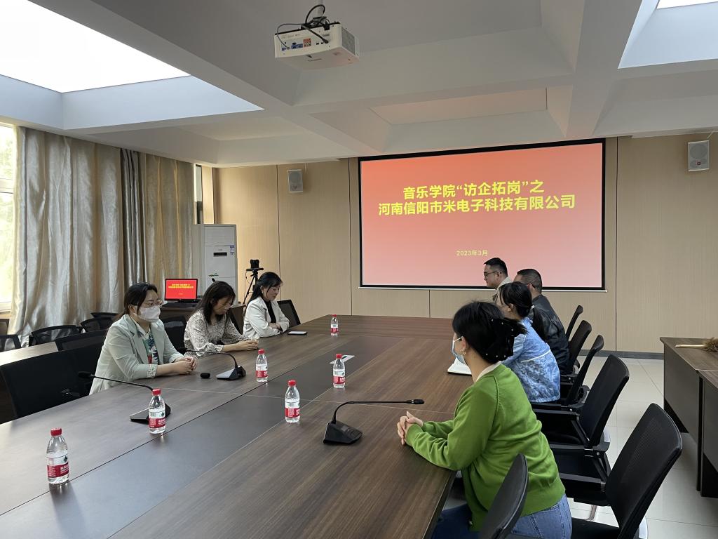 为落实学校关于“访企拓岗促就业”专项行动的要求,拓宽毕业生就业渠道,推进2023届毕业生就业工作,3月27日下午,河南信阳市米电子科技有限公司一行来音乐学院参观考察并参加校企合作洽谈会,音乐学院学工秘书李平、毕业班辅导员姚垚、李艳玲、梁二豪等接待了经理一行。