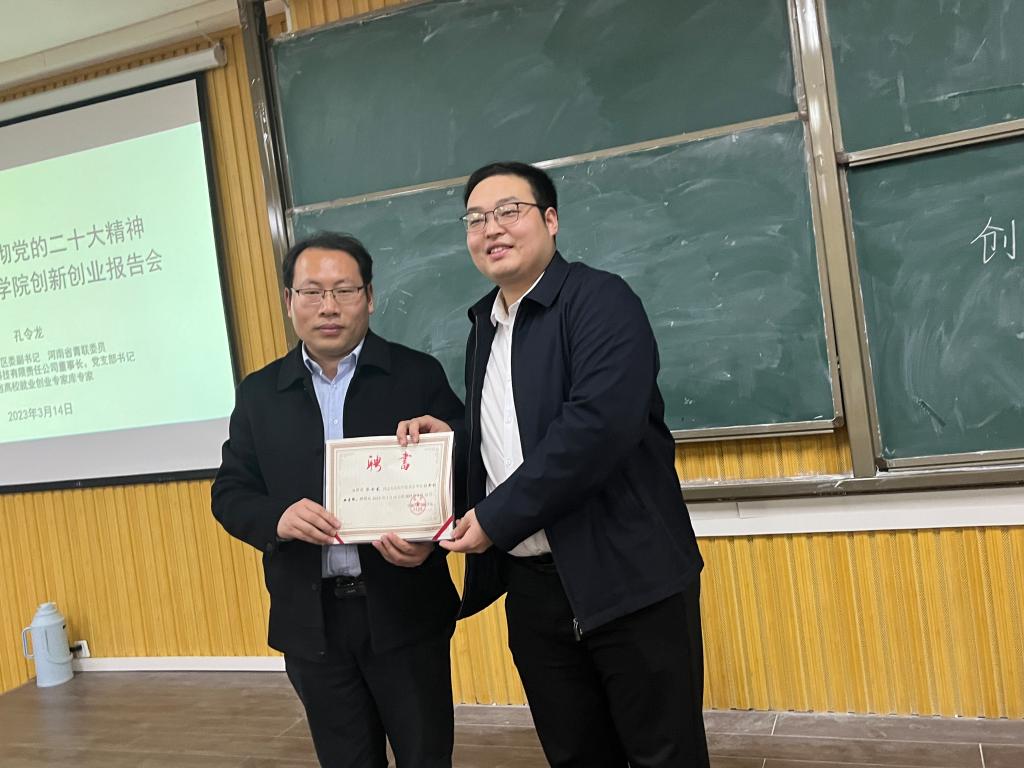 会议伊始,郑山峰代表学院为孔令龙颁布了信阳学院音乐学院创新创业导师聘书。