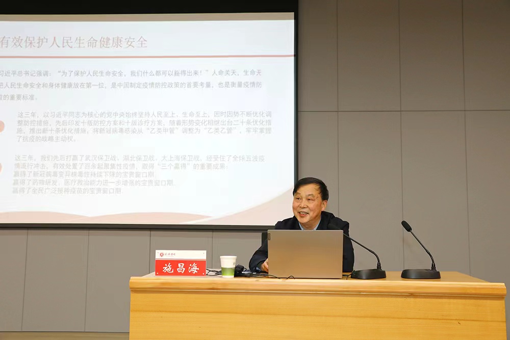施昌海以“不负时代、不负韶华,争做堪当民族复兴重任的时代新人”为题,结合党的二十大精神、全国两会精神和抗疫的历程进行了深入阐述。他首先带领大家回顾了三年的抗疫历程,指出在党中央的统一领导下,各级党委政府同人民一道,不仅有效保护了人民生命健康安全,同时增强了应对疫情等重大疾病能力,而且依然保持经济稳步增长,充分彰显了以习近平同志为核心的党中央的科学决策,凸显了中国特色社会主义制度的显著优势。接着,他指出,三年的抗疫实践形成了成功经验,即:科学决策和创造性应对是化危为机的根本方法,党中央的坚强领导是应对风险挑战的根本政治保证,中国特色社会主义制度是抵御风险挑战、提高国家治理效能的坚实保障,伟大抗疫精神是凝聚人心、汇聚民力的力量源泉。