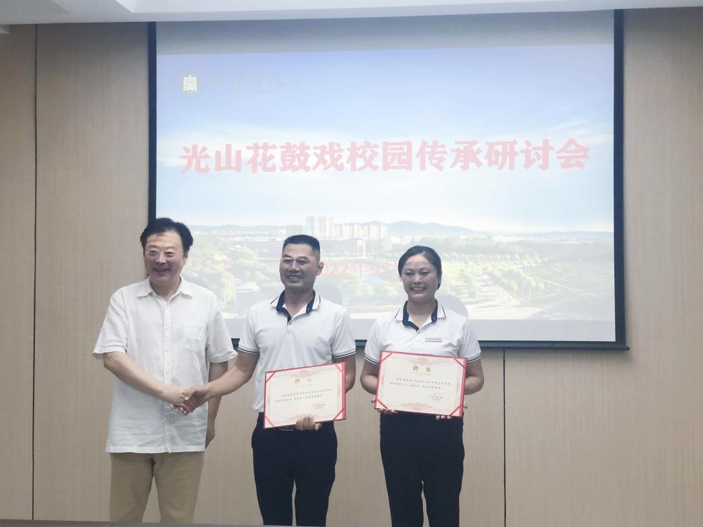 王志华代表学校向光山花鼓戏非遗传承人张秀芳、方应亮颁发了河南省首批中华优秀传统文化传承基地(光山花鼓戏)传习指导专家聘书。