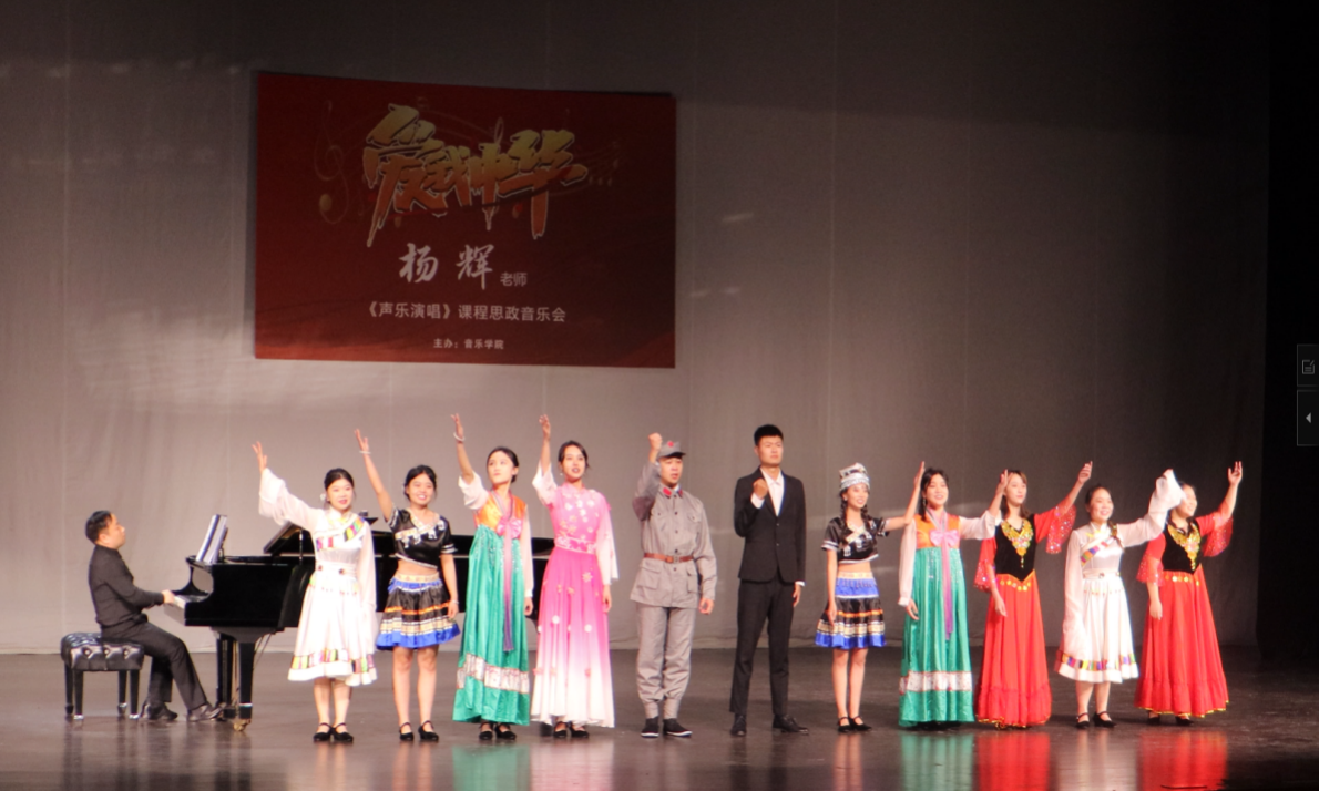 《声乐演唱》作为学校2021年度立项的“课程思政”示范课程之一,课堂授课以“声乐艺术+思政”的教学实践模式,把思想政治教育与专业课程设计紧密结合起来,遴选优秀中国声乐作品讲述“中国故事”,弘扬“中国精神”,使中国精神“入教材、进课堂、上舞台、入人心”,把深植于声乐作品中的价值观“基因式”地融入专业课程,把“立德树人”沁入到教学的各个环节,铸魂育人的同时强化了学生的专业实践能力。