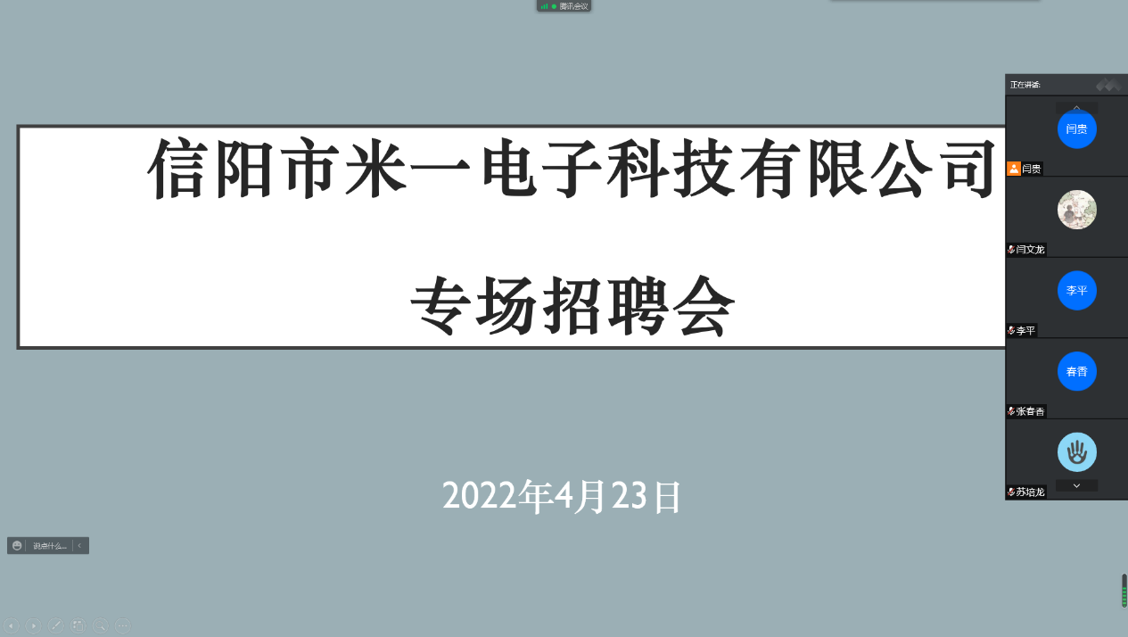 为进一步推进2022届毕业生就业工作,音乐学院以自身为平台充分挖掘各种资源,通过发动教师、联系校友等方式,积极引进各类相关专业用人单位,搭建用人单位与学生之间的信息桥梁,不让疫情成为阻断就业通道的障碍,确保毕业生顺利就业。4月23日上午,音乐学院通过腾讯会议平台举行了信阳市米一电子科技有限公司专场招聘宣讲会。学工秘书李平,辅导员梁二豪、闫贵以及2022届未就业学生参加了此次线上招聘宣讲活动,闫贵主持了会议。