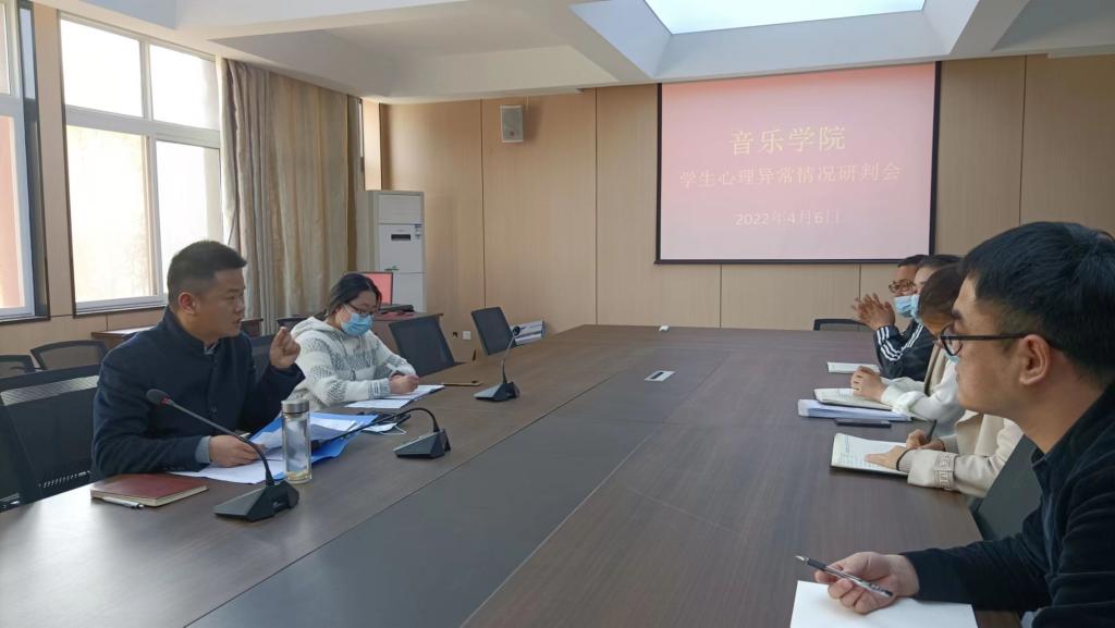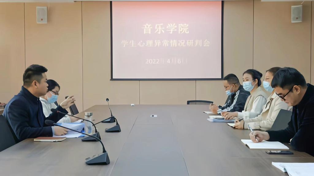 2022年4月6日上午,在艺术楼215会议室音乐学院召开了学生心理状况研判会。大学生心理健康辅导中心宋川川老师,张羽老师,音乐学院全体辅导员参加了会议,音乐学院心理辅导站站长姚垚老师主持了会议。