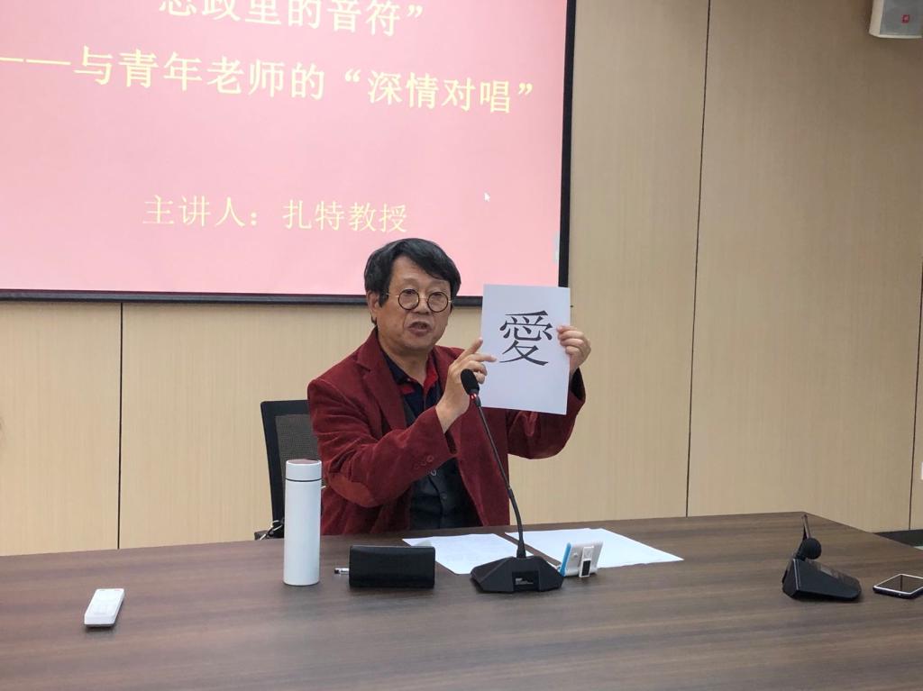 扎特结合自身多年教学经验,从“研究学生心理”“认真”“严格”“快乐”“幽默”“理解”“鼓励”“细节”等关键词切入,围绕“爱”这一主题阐述了一名教师在教学中应当持有的学生观和教学观。他以繁体字“愛”入手,分解了这个字如果没有心,就是一个“受”字,生动说明了教育教学中用心的重要性,希望大家在讲授知识、传递思想的过程中,能够因材施教,所授内容能够使学生听得懂、学得会、用得上。同时,扎特还从“职称”“珍惜”“努力”“主动”“勤奋”“激励”等关键词逐个与大家分析了青年教师发展中需要“修炼”的“内功”。扎特教授幽默风趣的分享和指导,让老师们在轻松的氛围中收获了满满“干货”。