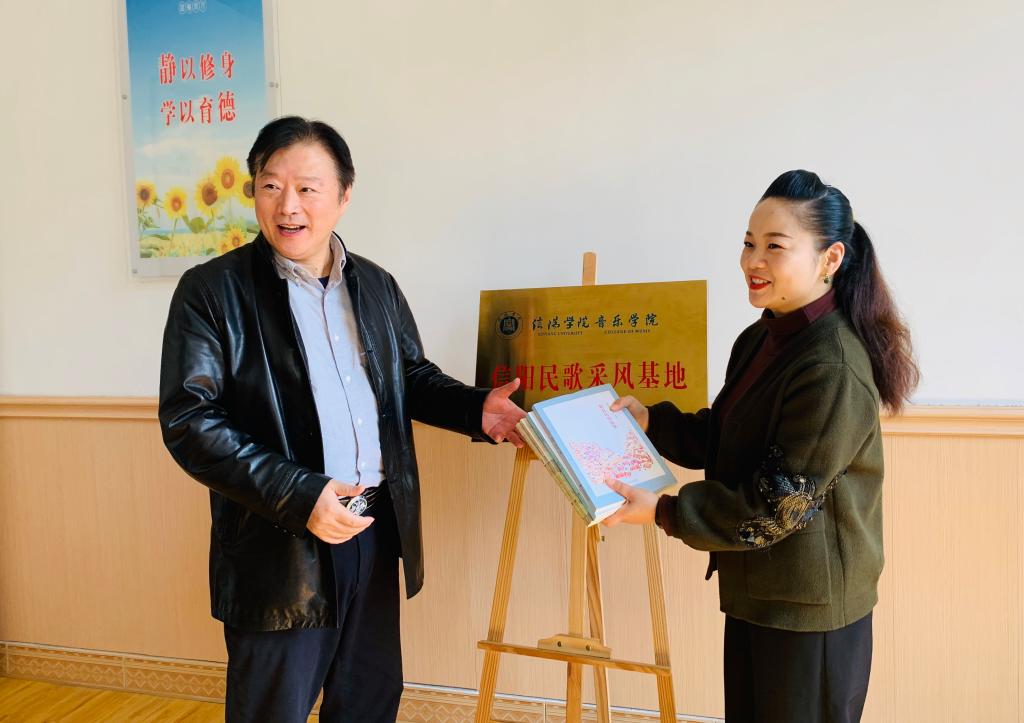10月29日,由音乐学院院长王凯歌率队,原平桥区文广旅局副局长郭楠、声乐与舞蹈教研室副主任朱永昌、"贤山"信阳民歌演唱团负责人董康坦等一行赴新县人民文化馆举行"信阳民歌采风基地"挂牌仪式,新县人民文化馆馆长戴军、副馆长张兰兰、主任张玉萍等热情接待了王凯歌一行,并出席了签约仪式。