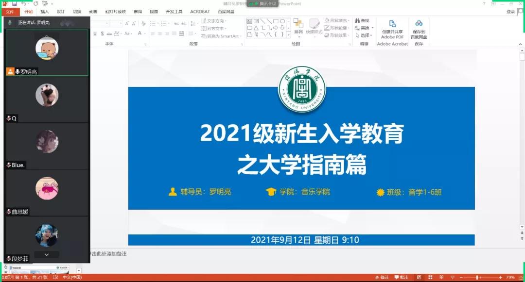 近日,为帮助大一新生更全面具体的了解学校基本信息和开学报到注意事项,2021年新进辅导员教师罗明亮、姚垚分别组织音乐学1-6班、音乐表演1-2班召开了大一新生线上主题班会。