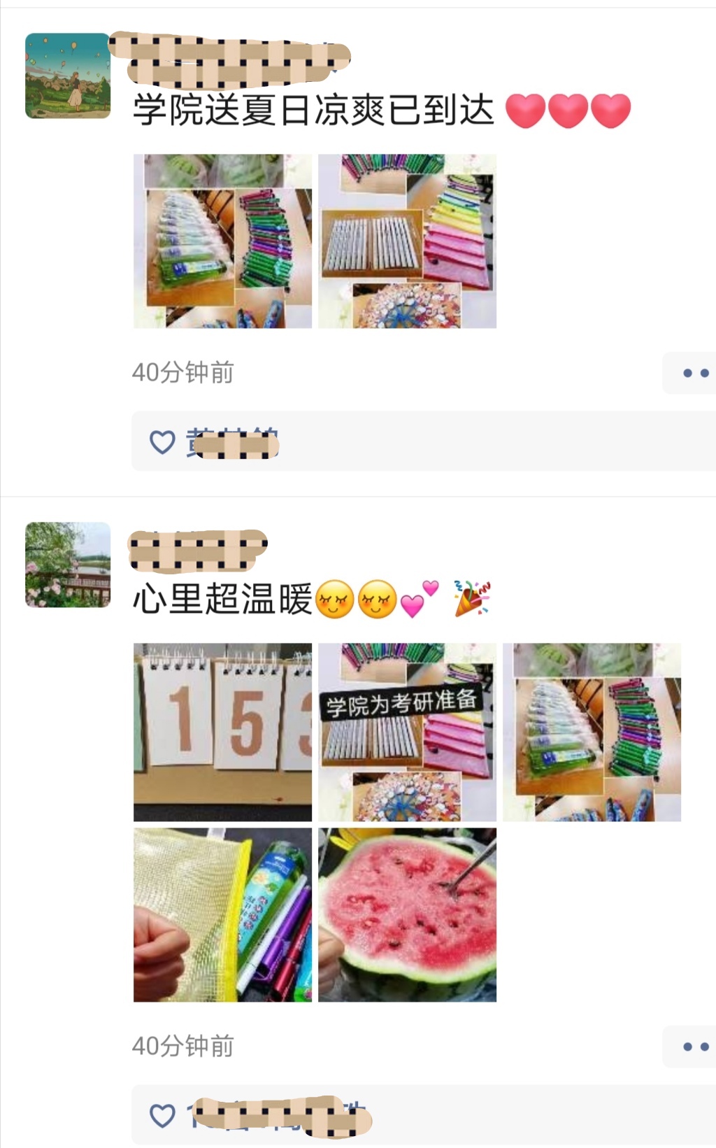 随后,领导老师为考研学生分发了西瓜、花露水、扇子、学习礼包等慰问品。