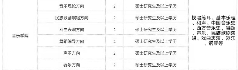 音乐学院现有音乐学、音乐表演2个本科专业和1个音乐表演专科专业,在校生1000余人,教职工50余人。其中教授6人,副教授8人,博士2人,外籍教师2人,留学归国教师16人,中国艺术研究所访问学者1人。他们来自美国天普大学、意大利塔兰托大学、意大利费尔默大学、乌克兰国立卢甘斯克大学、立陶宛教育科学大学、白俄罗斯国立音乐学院、俄罗斯格林卡国立音乐学院、俄罗斯圣彼得堡音乐学院、陕西师范大学、广州大学、中国艺术研究院、武汉音乐学院、浙江音乐学院、山东大学、山西大学、南京艺术学院、华南师范大学、湖南师范大学、河南大学等高校的硕士、博士研究生。