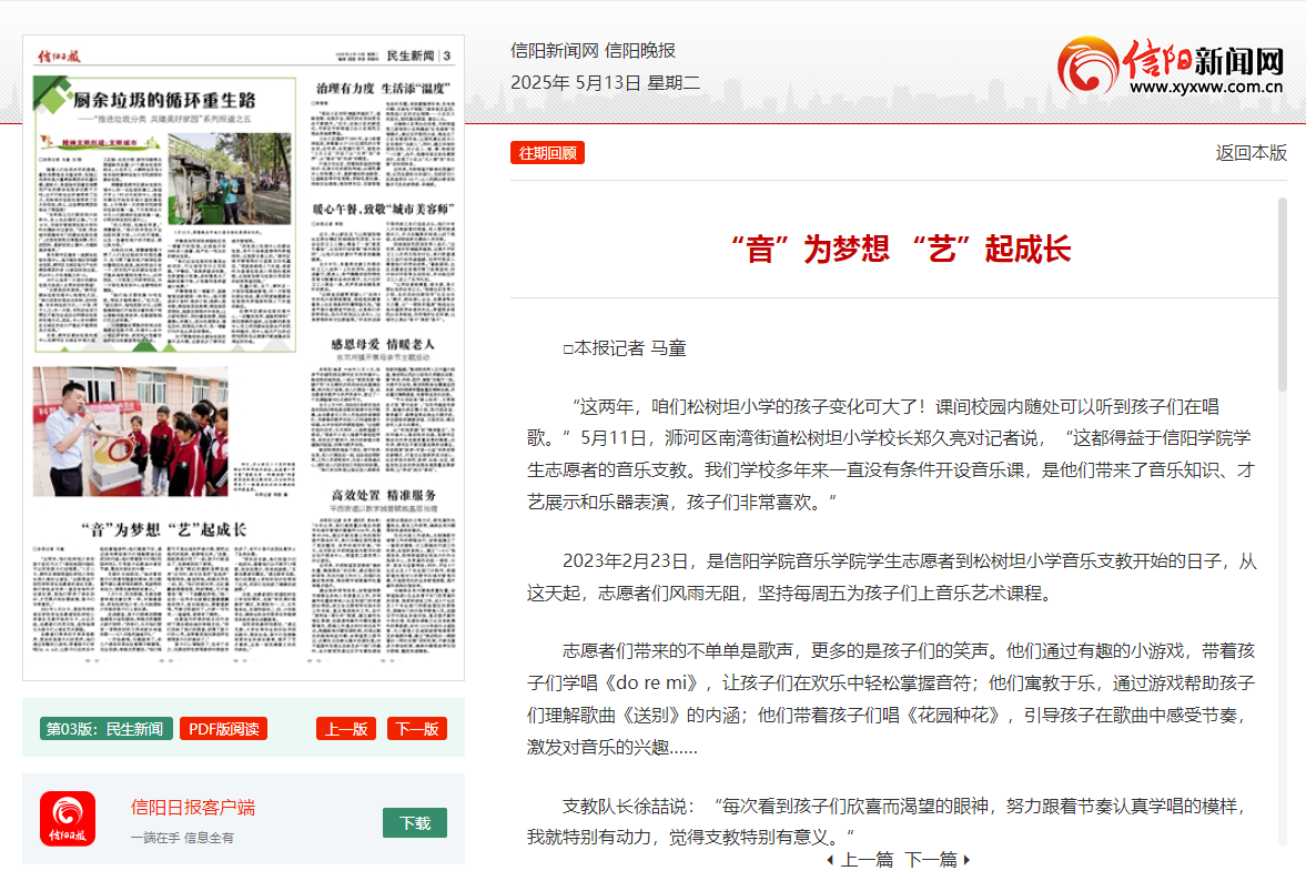 5月14日,信阳日报以《“音”为梦想 “艺”起成长》为题,专题报道了我校音乐学院美育浸润特色志愿服务成果。这不仅是对学校美育浸润项目在地方基础教育“生根开花”的体现,同时也是对音乐学院美育帮扶工作扎实推进的认可与肯定。