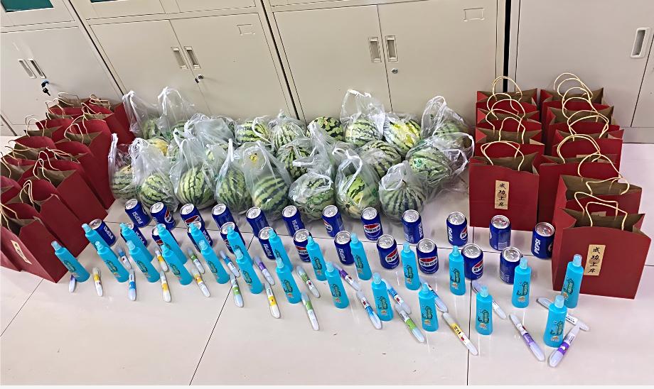 最后,学院领导和老师们将精心准备的西瓜、考研大礼包、花露水、饮料等物资一一分发到同学们手中。清甜多汁的西瓜,象征“瓜”熟蒂落、硕果累累,愿学子们的努力终得圆满;驱蚊避暑的花露水,寓意驱散烦扰、静心明志,守护备考的每一刻专注;活力十足的百事可乐,既为炎夏注入清凉能量,更暗含“百事皆可乐成”的殷切期盼;而浓墨重彩的记号笔,则祝愿同学们在人生考场上重点突出、金榜题名。这些精心挑选的礼物,如同盛夏里的缕缕清风,既是对艰苦奋斗的慰问,更是对光明未来的期许。