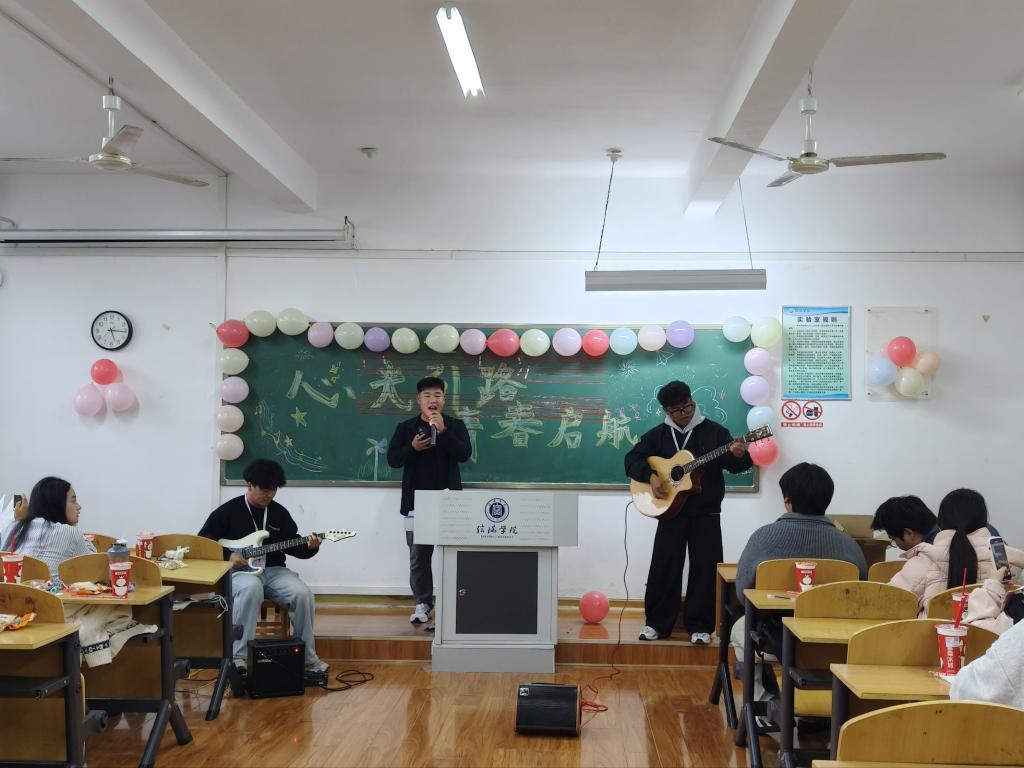 活动首先以“秋天的一杯奶茶”暖场环节迅速打破僵局。班委们手捧温热的奶茶,逐一向每位同学递去,搭配着酥脆的饼干,瞬间驱散了秋日的微凉。随后,由3名同学组成的小团队带来吉他弹唱表演,悠扬的旋律与清澈的歌声响起,不仅展现了音乐学院学子的专业素养,更让原本略带拘谨的现场氛围变得热烈起来,同学们纷纷跟着节奏轻轻哼唱,陌生感在音乐中悄然消散。