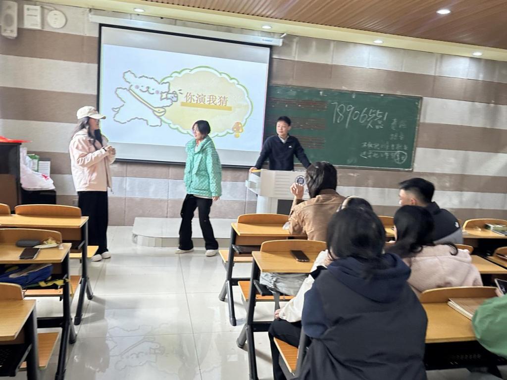 随后登场的“你来比划我来猜”游戏,是一个极度开阔脑洞的游戏。你比划我猜”环节将气氛推向高潮。一方队员使出浑身解数,化身“灵魂比手”,比划“电风扇”便原地旋转,模拟“目瞪口呆”则表情夸张。另一方则全神贯注,在同伴手舞足蹈的提示中飞速思考。一时间,场内掌声、欢笑声与恍然大悟的惊呼声此起彼伏。这不仅是智慧与默契的较量,更是一次绝妙的心理破冰,让同学们在紧密的互动与合作中释放了压力,真切感受到了团队的支持与欢乐。