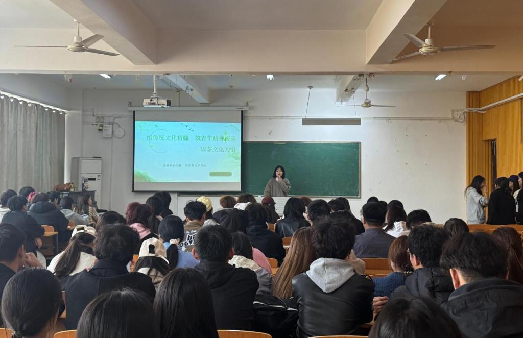 随后,赵老师聚焦“茶之礼”与“茶之德”,通过视频演示“温杯、投茶、注水、分茶”的传统茶艺流程,详解每一个动作中蕴含的“谦和、恭敬、专注”理念,并特别指出:“共青团员的责任担当,与茶文化中‘扎根土壤、奉献芬芳’的精神高度契合,青年学子要像茶一样,在平凡中坚守初心,在奋斗中释放价值。”