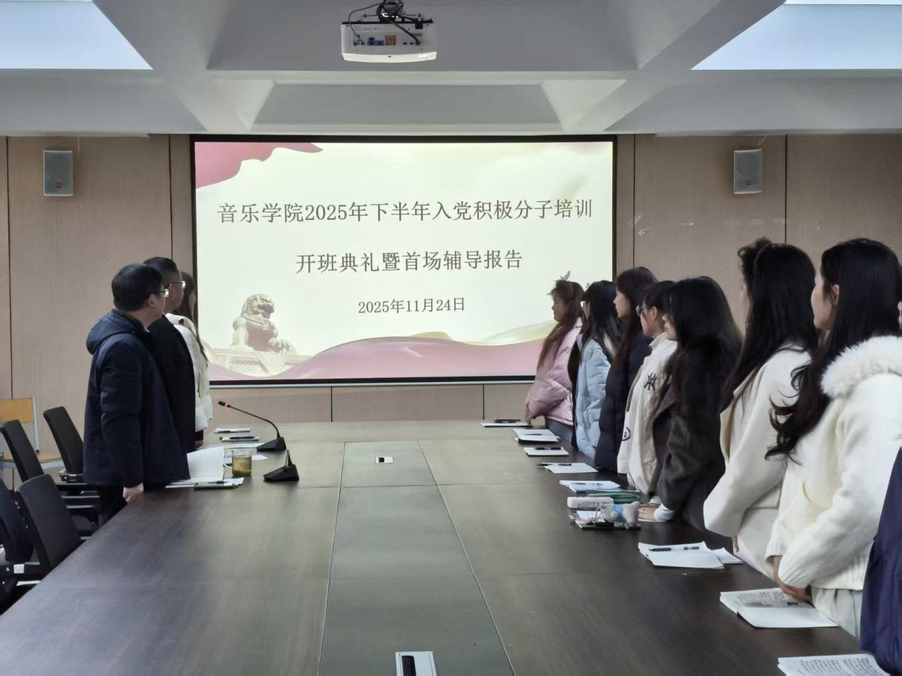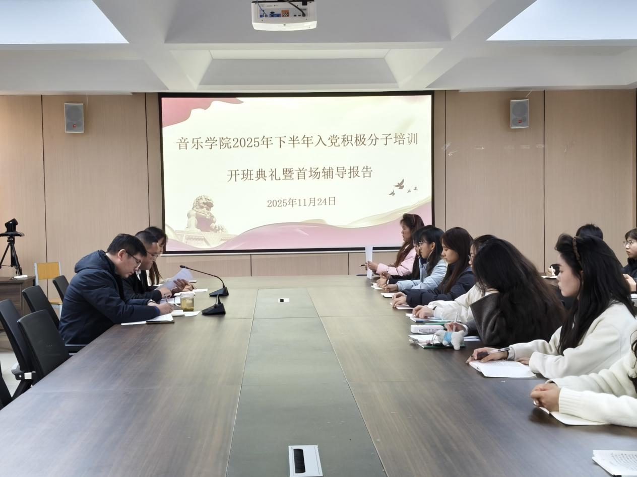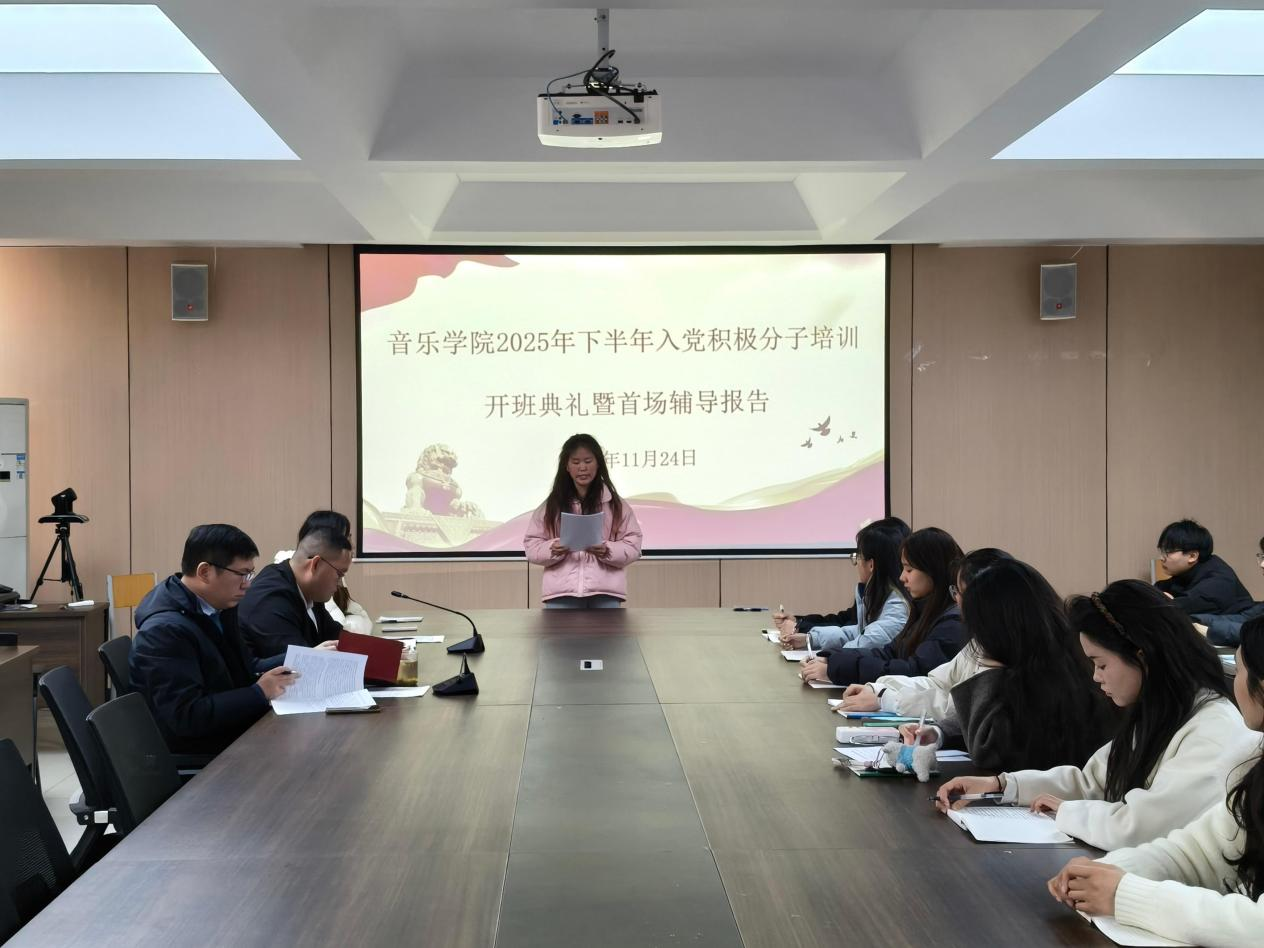 为切实加强入党积极分子队伍建设,提高入党积极分子的政治素养,加强理想信念,11月24日下午,音乐学院在215会议室举行2025下半年入党积极分子培训开班典礼暨首场辅导报告。学院党总支书记郝昊出席开班仪式并作专题辅导报告,学生党支部书记闫贵以及25名入党积极分子参加了培训。