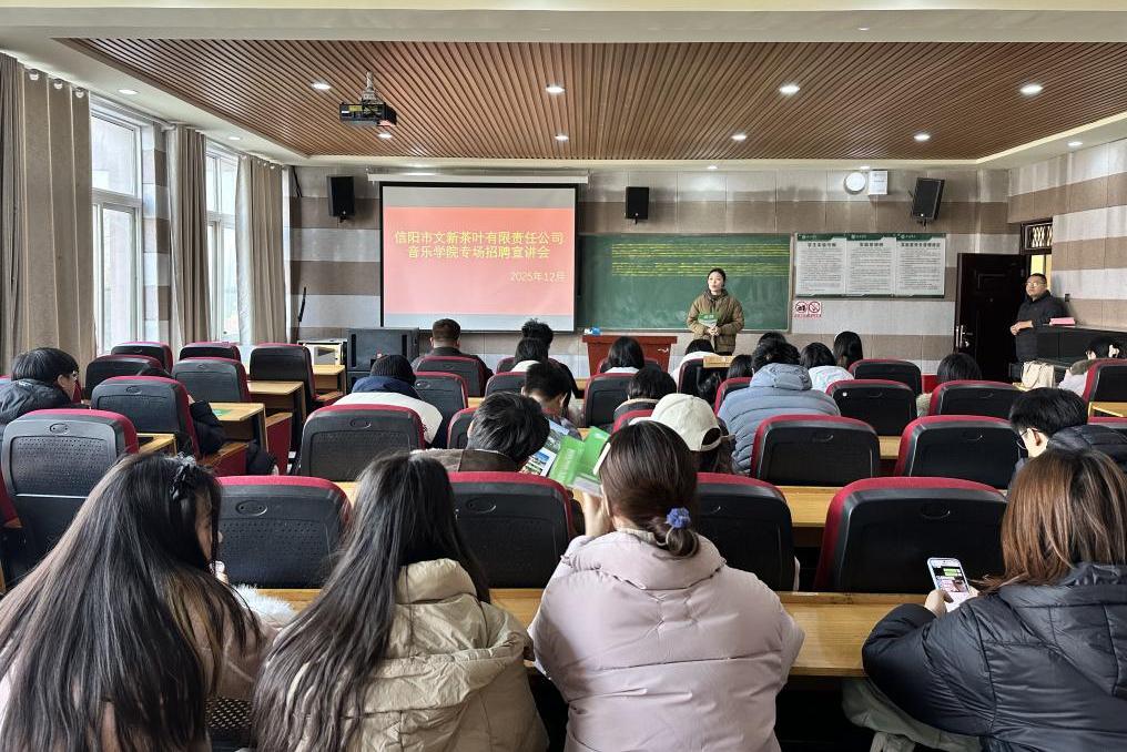 为了进一步推进2026届毕业生就业工作,12月5日上午,音乐学院在艺术楼205教室举办了信阳市文新茶叶有限公司专场招聘宣讲会,毕业班辅导员老师及2022级毕业生参加了此次宣讲会。