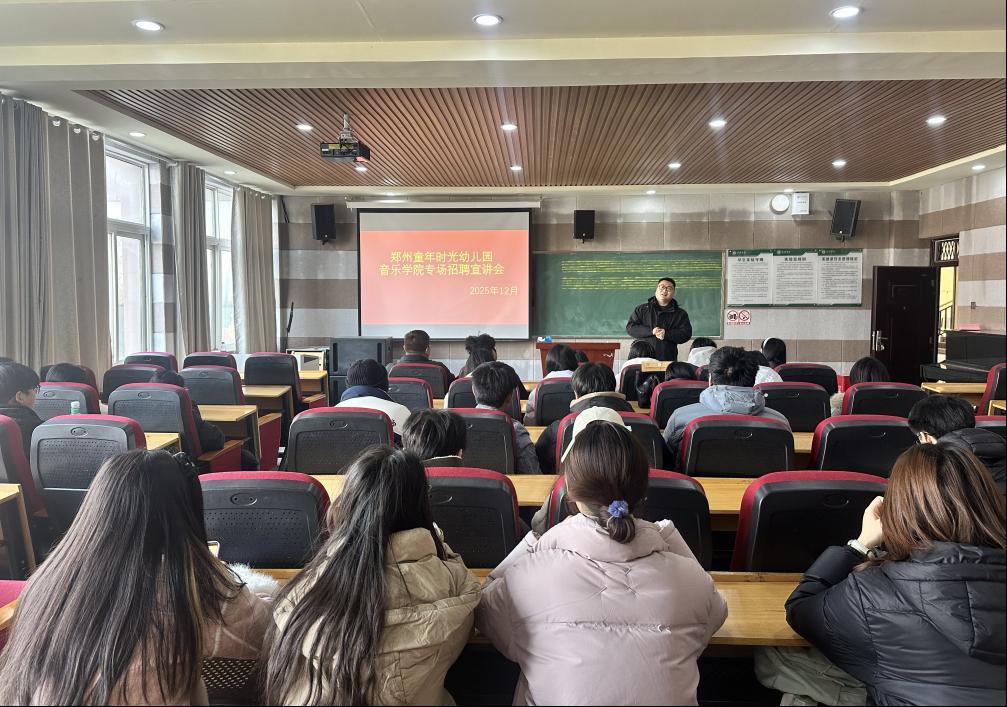 为了拓宽就业与发展渠道,推进2026届毕业生就业工作,12月5日上午,音乐学院在艺术楼205教室,举办了郑州童年时光幼儿园招聘宣讲会,学院毕业班辅导员及2022级部分毕业生参加了此次宣讲会。