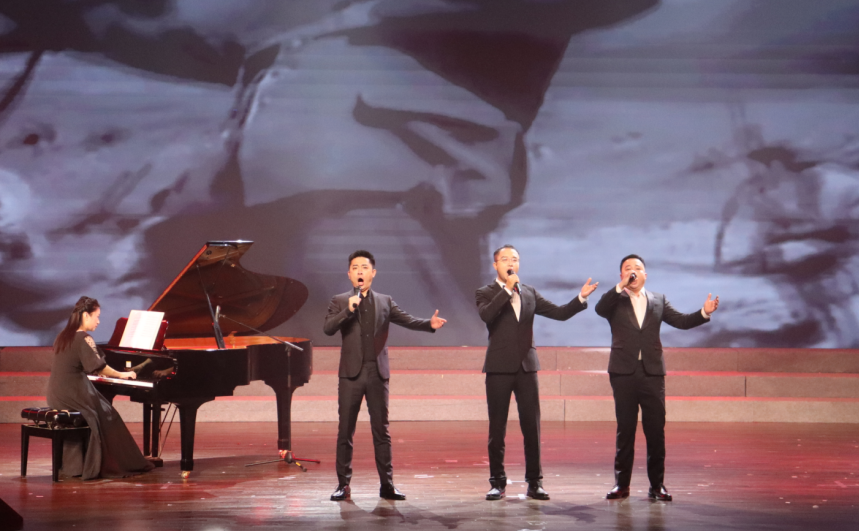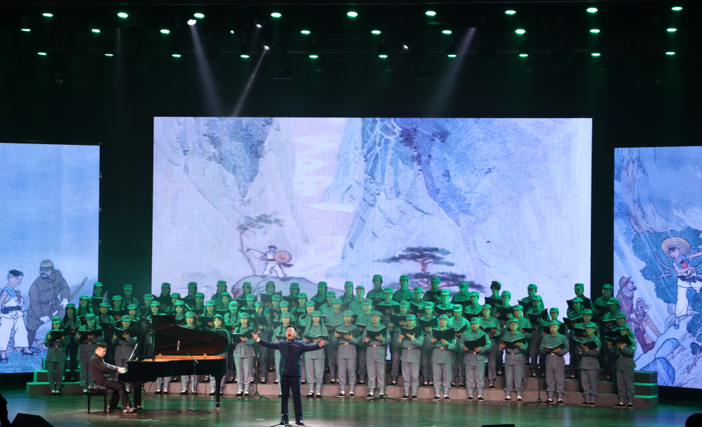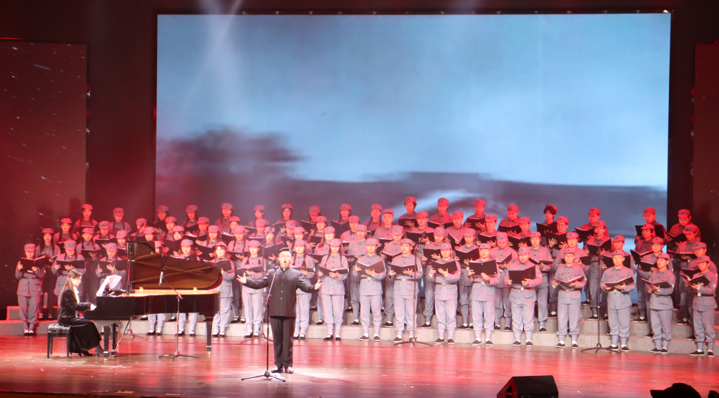 步入“铁血抗争铸脊梁”篇章,旋律陡然激昂:情景朗诵《这束光》以青年对话的形式,让不同时代的热血青春隔空共鸣,诠释出青年对引领民族前行的“希望之光”的思考与感悟;《在太行山上》《保卫黄河》的混声合唱气势如虹,钢琴协奏曲《黄河协奏曲・黄河愤》奏响抗争的强音,男声合唱《弹起我心爱的土琵琶》《游击队歌》则洋溢着乐观昂扬的战斗情怀,共同谱写了中国共产党领导下军民奋勇抗敌的英雄史诗;而《军民大生产》《纺线线》《南泥湾》的轻快节奏与古筝合奏《丰收锣鼓》的喜悦氛围,又将革命先辈自力更生、军民同心的奋斗场景娓娓道来。