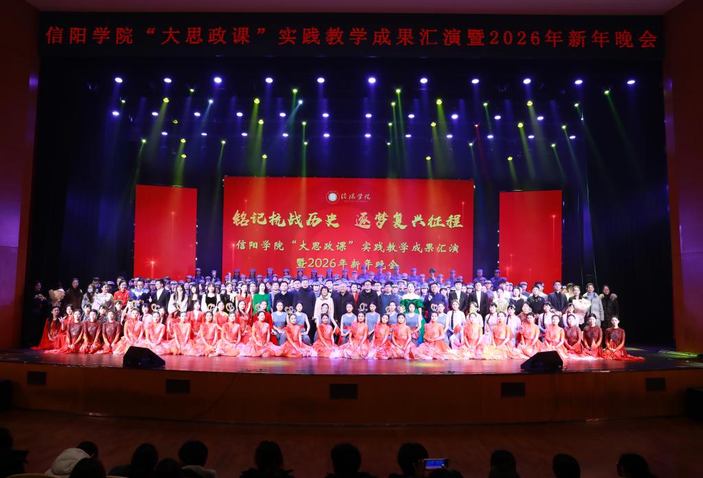 值此2026年新年将至之际,信阳学院“大思政课”实践教学成果汇演暨2026新年晚会在学校音乐厅倾情上演。学校理事长高云携全体校领导,各学院党总支书记、院长,以及教师代表与800余名学生齐聚现场,共赏这场思政与艺术交融的盛宴;另有6000余人次通过线上直播同步收看,共同见证教学成果、喜迎新年到来。