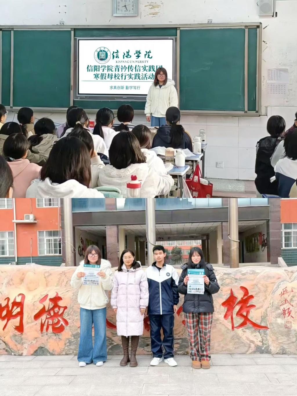 张涵宇与队友组成“乐教知行时间团”,怀揣感恩与分享的初心,重返鹿邑县伯阳双语学校华。宣讲会上,他们从信阳学院的校史传承、办学理念讲起,深入剖析优势学科的发展前景,并生动介绍了便捷的校园生活、多姿多彩的文体与社团活动,为学弟学妹勾勒出一幅立体而充满吸引力的大学生活图景。通过生动的讲述与精心制作的校园影像,台下同学们的目光中充满了专注与憧憬。活动尾声,团队不仅邀请大家填写调研问卷,结合自身经历耐心解答各类疑问,还真诚分享了高考志愿填报的经验与思考。此外,张涵宇团队专程拜访昔日恩师,汇报大学期间的成长与收获,聆听老师的教诲与勉励,在重温师生情谊与奋斗初心中,再次坚定了前行的方向。