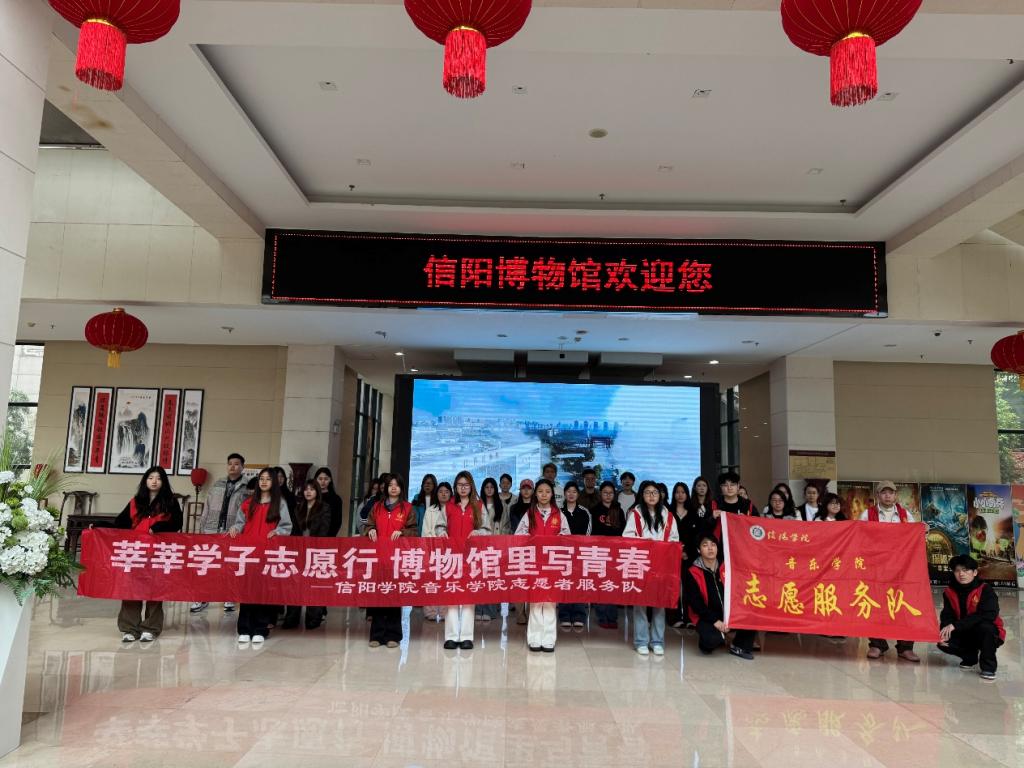 2026年4月12日,音乐学院组织志愿者服务队前往信阳市博物馆开展志愿服务活动,旨在使青年学子在深化校地合作中感受地方历史文化的无限魅力。