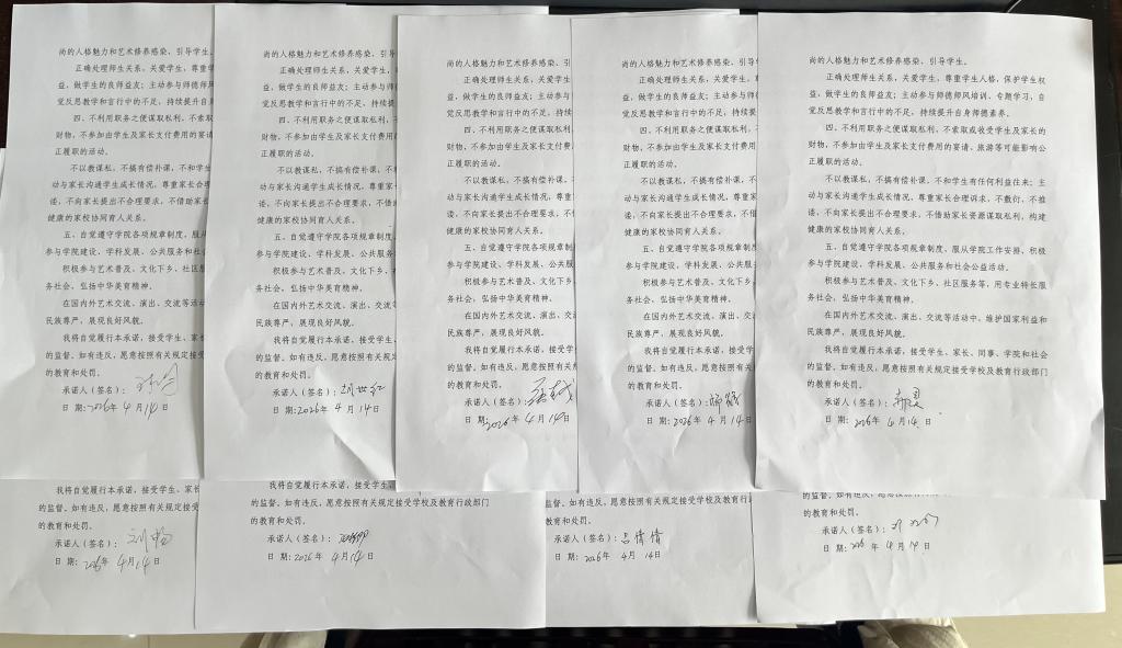 为进一步强化责任落实,固化学习成果,会上还组织全体教职工签署了《音乐学院师德师风个人承诺书》。承诺书明确了教职工在师德师风方面的具体责任与行为准则,涵盖坚守育人初心、严守职业底线、规范教学行为、关爱学生成长、净化自身言行等多个方面,既是对师德规范的再次重申,也是教职工对自身职业行为的庄严承诺。签署过程中,全体教职工郑重落笔,认真阅读承诺书各项条款,深刻认识到承诺书的重量与意义,纷纷表示将以承诺书为行动指南,严格履行承诺,自觉接受监督,以实际行动践行师德规范,坚守教育初心,潜心立德树人。