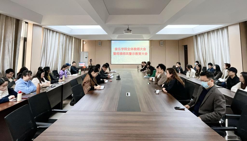 为深入贯彻落实新时代师德师风建设要求,强化全体教师责任意识与底线思维,统筹推进学院各项工作,4月14日,音乐学院召开全体教师大会暨师德师风警示教育大会。学院班子成员及全体教师参加了会议,党总支书记郝昊主持了会议。