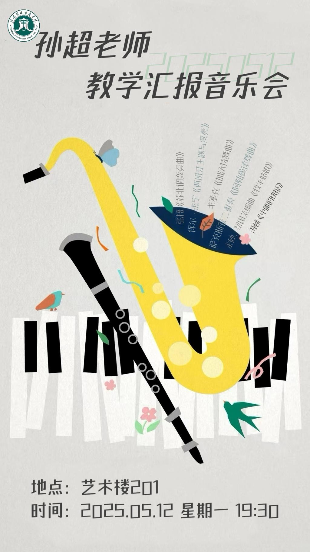 孙超,信阳学院音乐学院单簧管、萨克斯管专业教师,中国管乐协会会员,湖北省音乐家协会会员。本科、硕士毕业于武汉音乐学院,师从著名单簧管演奏家教育家王启晨教授及陈新老师,并于在校期间跟随张如兴教授学习低音提琴。武汉音乐学院自主培养的首位单簧管艺术硕士研究生。指导学生参加各类专业比赛并多次获得优秀指导教师,指培养多名优秀学生考入国内外音乐学院。